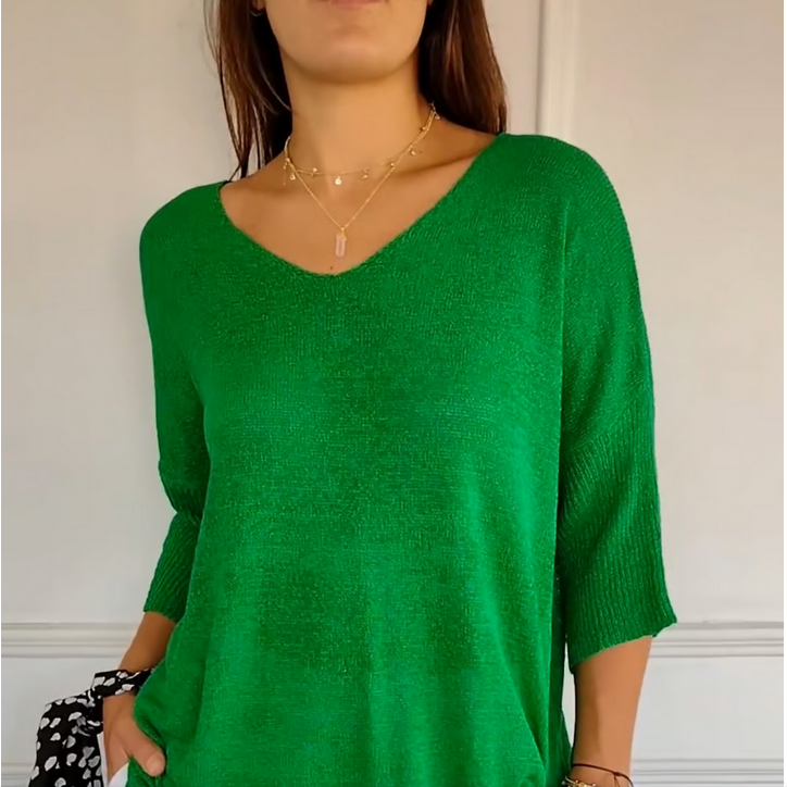 Denne strikkede top er en ægte revolution inden for mode! Dens V-hals tilføjer et moderne og elegant præg, samtidig med at den er utrolig komfortabel. Et must-have for at forblive trendy!